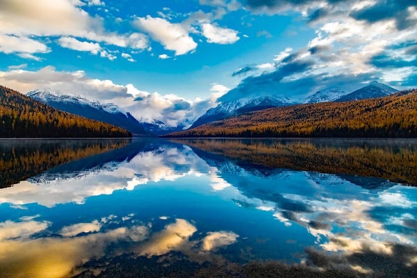 An imitation laughing back clear as day at dawn where shore reaches up to touch the land